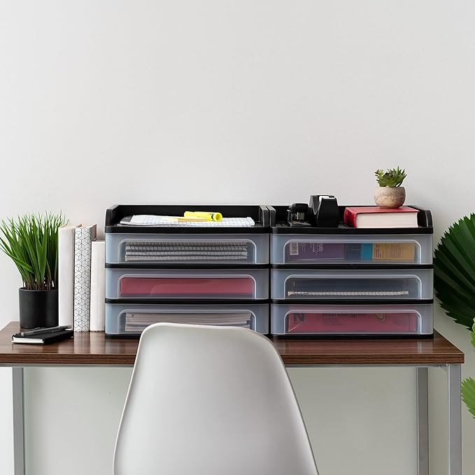 IRIS USA Plastic Desk Top 3-Drawer Storage Organizer with Paper Tray Top, 1-Pack, for Makeup Vanity Nail Polish Bathroom Stationery Art Craft Supplies Kitchen Office Garage Organization, Medium, Black