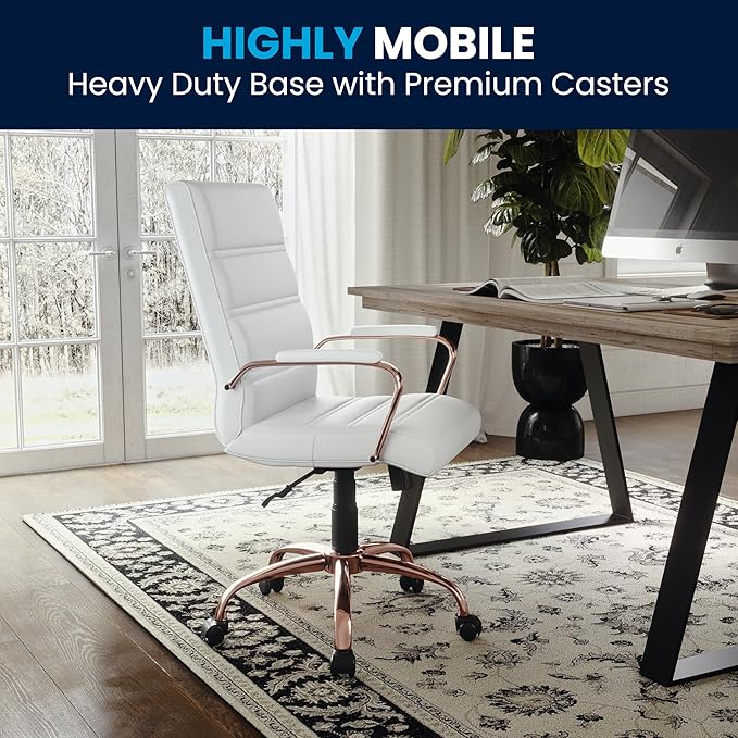 - UPGRADE YOUR WORKSPACE: Boasts a soft mid-back white LeatherSoft back and seat paired with a rose gold metal base and armrests all highlighted by an attractive horizontal line stitching to boost your desk or work area with modern style