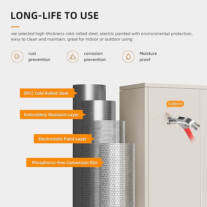 - 『Stelel Material』: Metal storage cabinets designed with whole-in-one reinforced metal frame, the steel plat of lockable metal cabinet with thickness up to 0.8 mm, solid and strong. Also we adopt electrostatic spray painting to office file cabinet, the large cabinet for long term use
