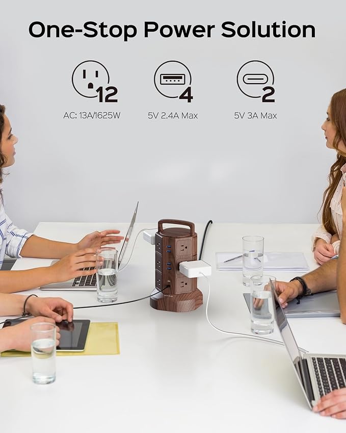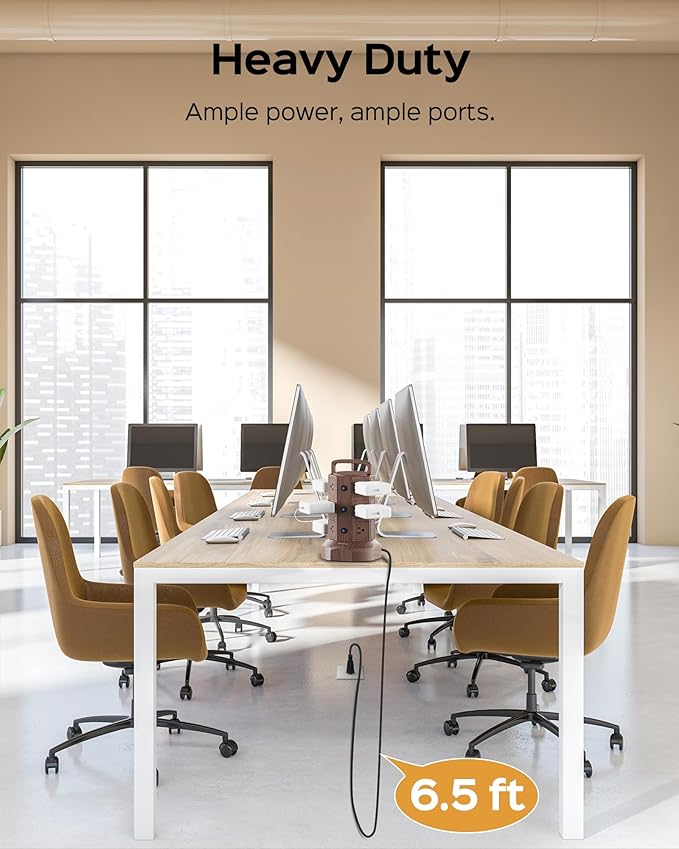 JACKYLED Power Strip Tower Surge Protector with 6.5ft Extension Cord 6 USB Ports and 12 AC Outlets Electric Charging Station for Home Office Dorm Desktop Computer Walnut and Black
