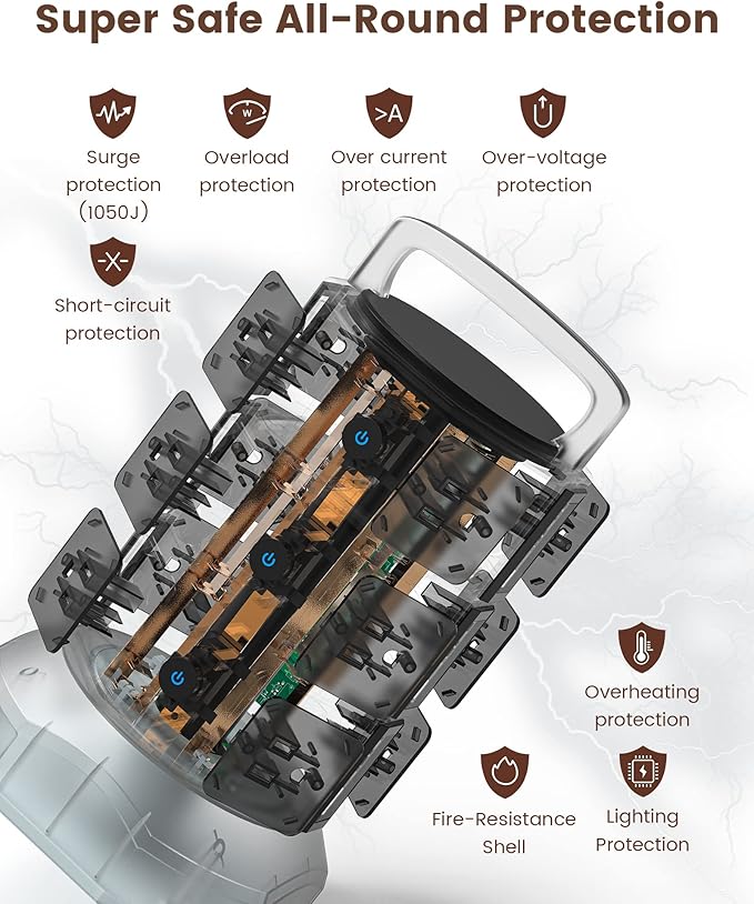 - SAFETY: This power strip with USB has surge protection (1050J), overload protection, short-circuit protection, over current protection, over voltage protection and overheating protection. It will automatically cut power to protect your valuable devices when the voltage surge is overwhelming.
