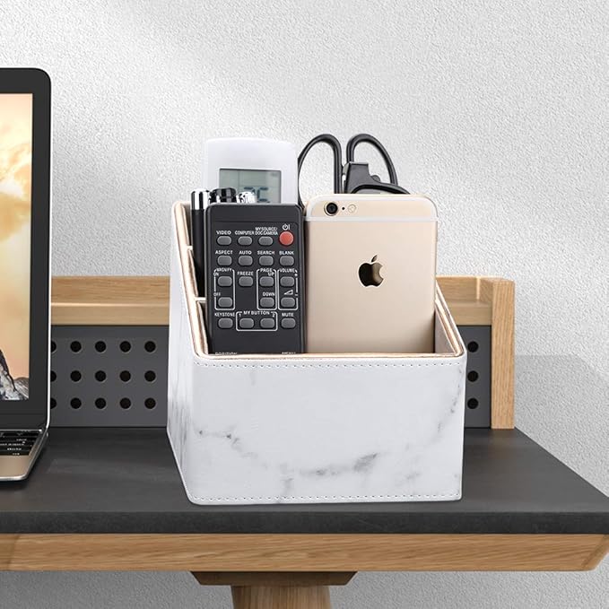 KINGFOM Remote Control Holder with 3 Compartments, Pu Leather Remote Caddy Desktop Organizer for TV, CD, Blu-Ray, Media Player, Heater Controllers and Cosmetics Office Supplies (White Marble)