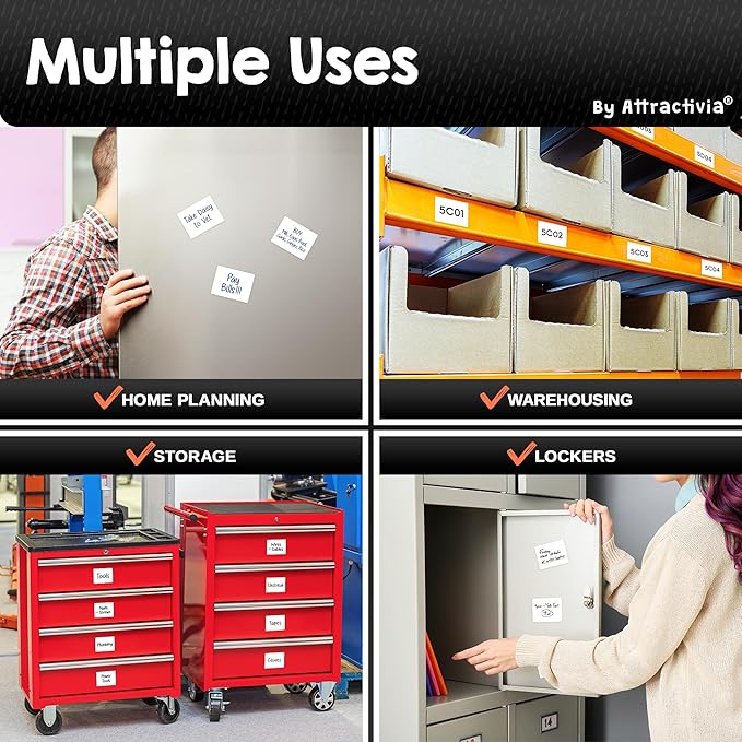 - Premium Quality: Our magnetic labels for whiteboard feature a white, dry erasable front, ensuring smooth writing and easy wiping. No more ghosting, streaks, or dull markings. Every message stays clear and professional with our magnetic labels for shelving. Each label measures 2.8 x 1.8 inches.