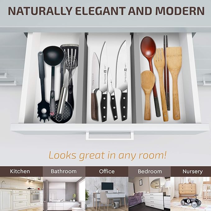 - Easy to Use with Added Protection: Simply slide the divider into place in any kitchen, bedroom, office, or bathroom drawer. Equipped with EVA foam padding, it protects your drawers from scratches and ensures the divider stays securely in place without slipping. Achieve organized storage in seconds, with the flexibility to remove or reposition as needed.