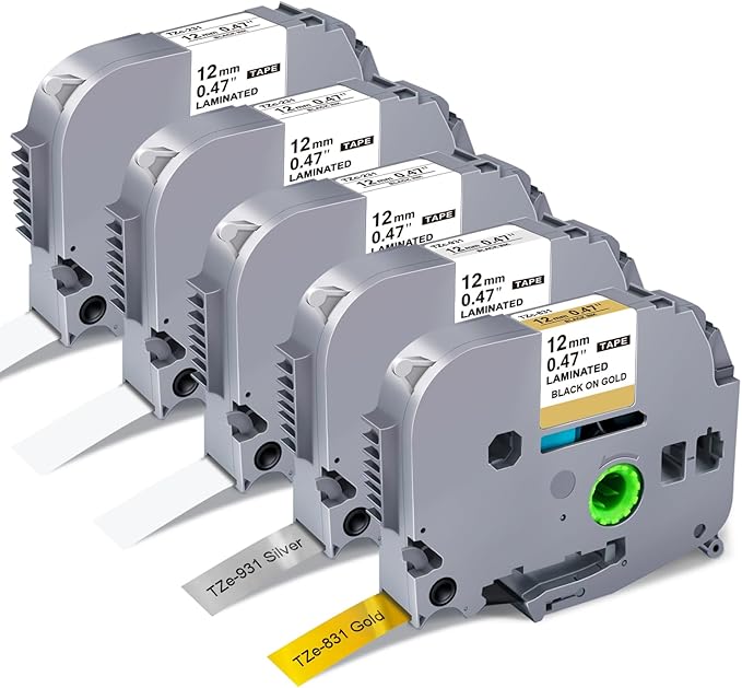 - Package Includes: 5-Pack Replacement for Brother P Touch label maker tape refill; Mode & Color: 3x TZe-231 (Black on White), 1x TZe-831 (Black on Gold), 1x TZe-931 (Black on Silver)