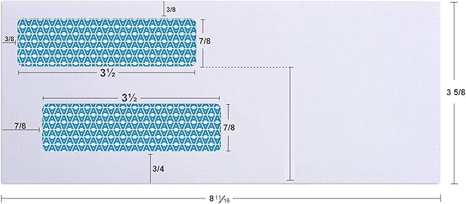 - ✉️ DUAL WINDOW CUSTOM DESIGNED FOR MAILING BUSINESS CHECKS: Top Window height is 7/8 inch X 3-1/2 inches wide and is positioned 3/8 inch from the left and 2-3/8 inch from the bottom, Bottom Window height is 7/8 inch X 3-1/2 inch wide and is positioned 7/8 inches from the left and 3/4 inches from the bottom
