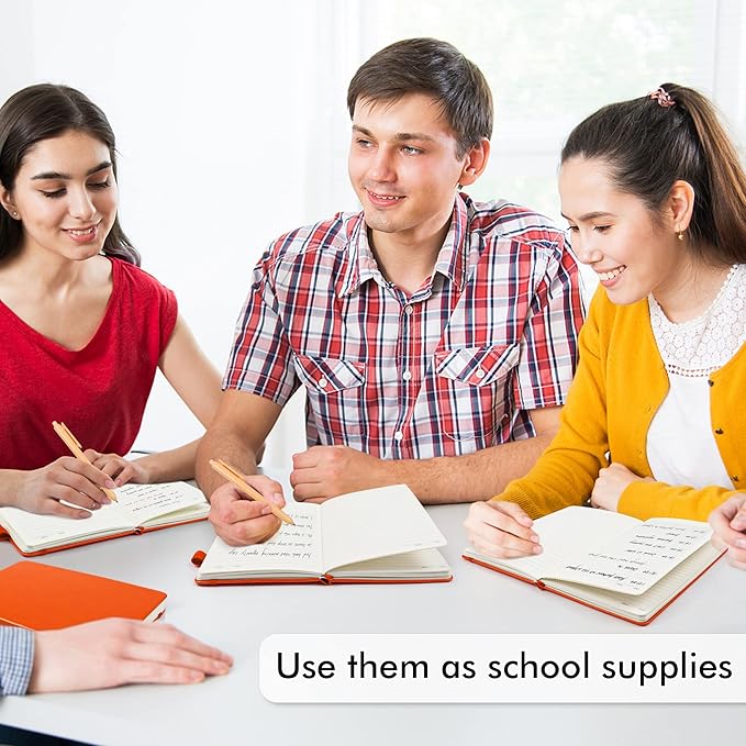 - Feela 12 Pack Classic Ruled Notebooks contains 12 classic orange ruled sturdy cover notebooks and 12 Black Retractable Pens. Each of the notebooks measures 8.3” x 5.1”, which is perfect to carry and easily held by young girls and boys. These black cute pens are customized to be placed in the pen holder, which is pretty convenient.