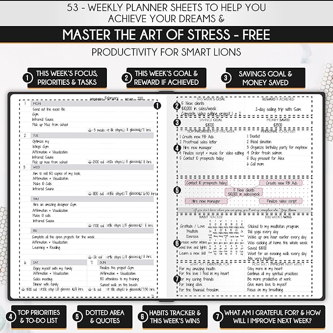 - LIFE PLANNER - A5 Size, 212 pages of life transformation, 53 weekly, 12 monthly planning overviews & reflection, 22 dotted journal pages, habit trackers, mind maps, morning & evening routines, inner pockets, pen holder & gift box