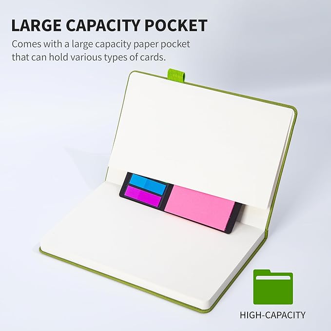 - đăMultifunctional AccessoriesăâThis classic 5.6" x 8" vegan leather journal features a durable and water-resistant cover, 160 college ruled lined pages, inner expandable pocket, pen holder, ribbon bookmark & elastic closure band
