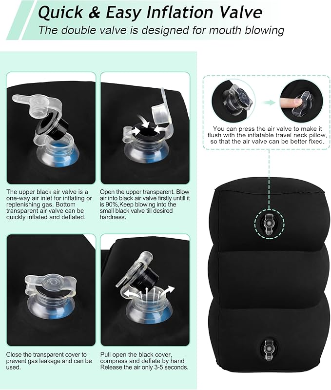 - ✈️UNIQUE HUMANIZED DESIGN: This inflatable leg rest has two separate air chambers. The lower chamber for 1-level height, and the upper chamber for 2-level height. With 2-in-1 double valve, the upper black air valve is a one-way air inlet for inflating or replenishing gas. Bottom transparent air valve can be quickly inflated and deflated. What's more, the double valve is designed for mouth blowing, It only takes about one or half minutes with a few breathes. Release the air only 3-5 seconds.
