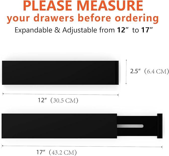 - EXPANDABLE AND ADJUSTABLE DESIGN: The drawer organizer set comes with four expandable drawer divider pieces, and each drawer divider is 2.5" tall, 0.6" thick and expandable from 12" to 17" in full length; so that you can rearrange to your desired structure, our drawer separators are adjustable to fit large spacious kitchen drawers and even your shortest and most narrow office drawers. So you can take full advantage, be sure to measure your drawers prior to purchase as our expandable drawer organizer set