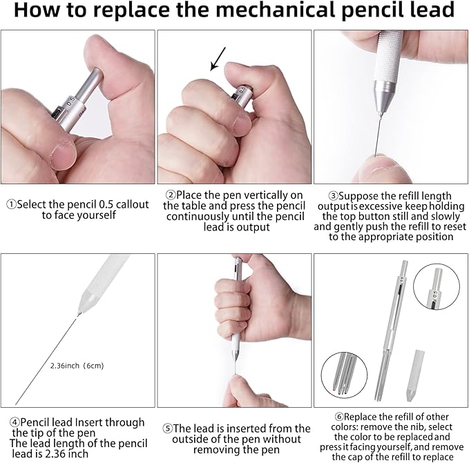 - Switch refills: first select the color you need, mark the words of the color facing yourself, tilt back 30 degrees to hold the pen press to get the desired color refill, then press the reset button on the clip to recycle the refill.