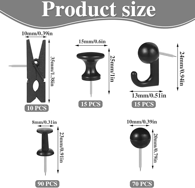 - 【Easy to Use】Our black push pins can easily nail it to the board or take it off without hurting your hands and without leaving obvious holes in the surface. Our push pins clips can hold the paper together well, and the push pin hooks can also easily hang 20lb products, easy to use.