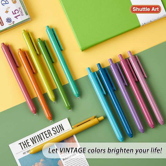 Shuttle Art Ballpoint Pens, 15 Pack Vintage Retractable Black Ink Ball Point Pens, Cute Pens 1.0mm Medium Point Quick Drying for Writing Journaling Taking Notes School Office Home