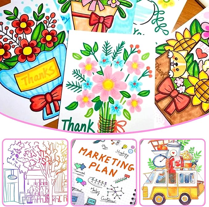 - 【Convenient Fine Tip & Brush Tip 】 Our brush pens for coloring feature a fine tip and a flexible nylon fiber brush tip. You can create ultra-fine lines with the 0.4mm fine tip, and achieve medium or bold strokes by adjusting the pressure with our soft adult coloring markers, which range from 1mm to 4mm. Users can quickly distinguish between the two tips due to the markings on the soft and fine tips of the pen. The dual-tip design enhances the convenience and ease of your drawing process.