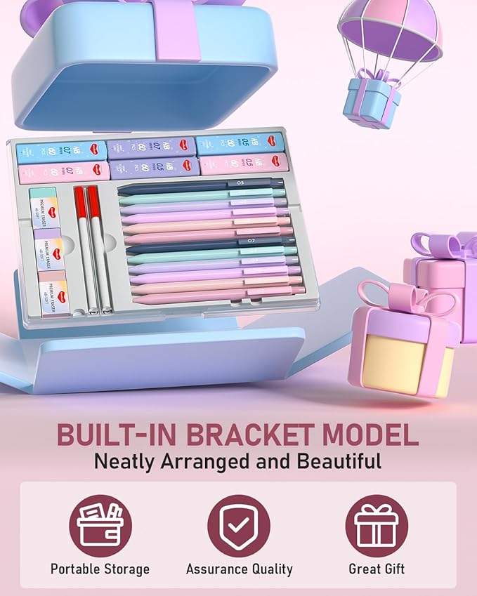 - Valued Mechanical Pencil Set - includes 6 PCS 0.5mm mechanical pencils and 6 PCS 0.7mm mechanical pencils in pastel color (pink, navy, blue, violet, rose, purple), 720 PCS HB(#2) lead refills, 3 pastel erasers, 18 small eraser refills and 1 plastic storage case. The perfect school supplies set for students