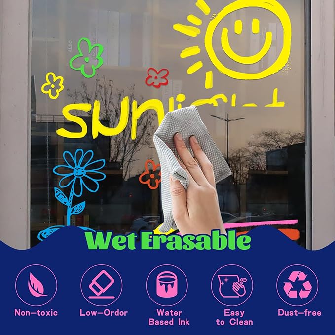 - 【Effortless Cleanup】Bid farewell to mess with these completely dust-free window paint markers. They function as wet erase markers, easily wiped off most non-porous surfaces using a damp cloth. Remember to cap the Wet erasable glass pen window marker after each use to prevent drying out.