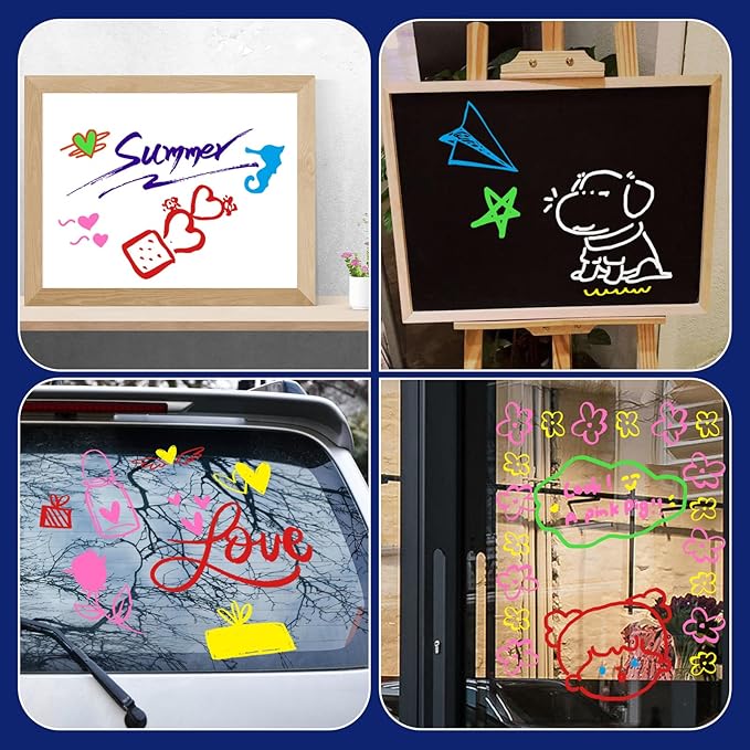 - 【Versatility Across Surfaces】Whether used as auto window markers or for glass washable projects, these jumbo chalk markers prove their versatility on any non-porous surface. Ideal for car decoration, whiteboards, chalkboards, bistro boards, Christmas banners, posters, and various DIY arts and crafts.