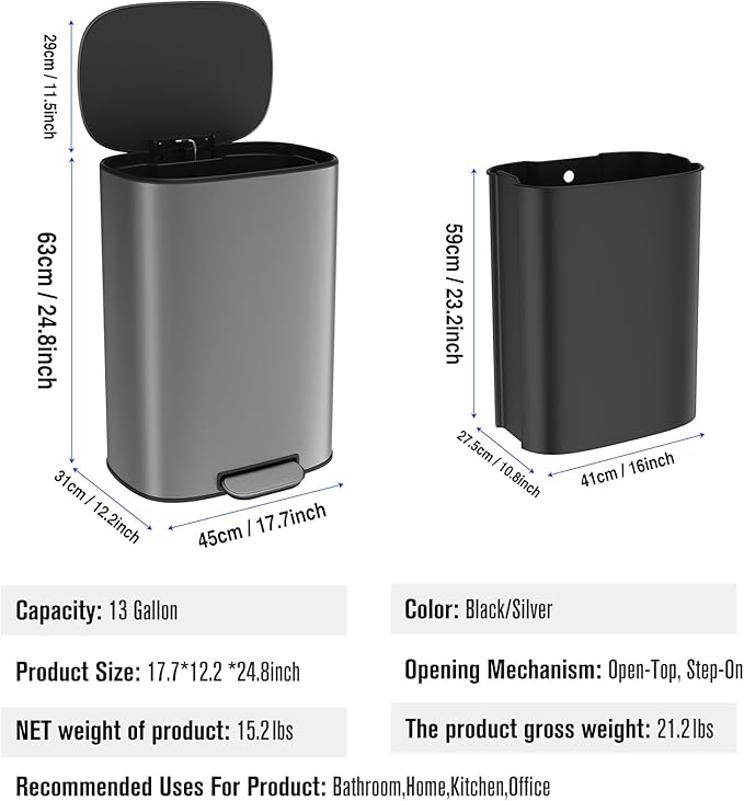 - LARGE CAPACITY TRASH CAN: 12.2''LΓ17.7''WΓ24.8''H, 13.2 gallon(Please Note: Due to the curved angle edges of the box, manual measurements may have a slight error, and the actual size may be slightly larger). The huge capacity definitely meets your daily use, this can fits most brands of 13 gallon trash bags. It can be a good helper for your kitchen & make your room clean and tidy. The sophisticated oval appearance also makes it suitable for a variety of occasions.