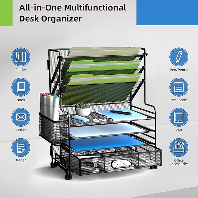 - 【All-in-One Desk Organizer – Maximize Space】This desk organizer combines a 4-tier paper tray (horizontal) and 3-pocket file holder (vertical) to efficiently utilize both horizontal and vertical space. Perfect for organizing documents, folders, and office supplies without cluttering your desk. Ideal for home office, classroom, or workspace.