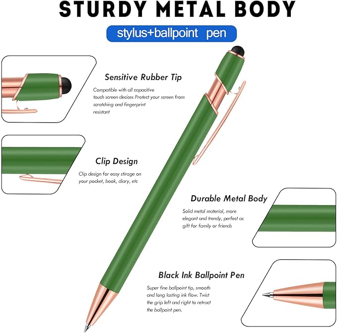 12 PCS 2 in 1 Stylus Ballpoint Pen with Stylus Tip, 1.0 mm Black Ink Metal Pen Stylus Pen for Touch Screens (Light Green)