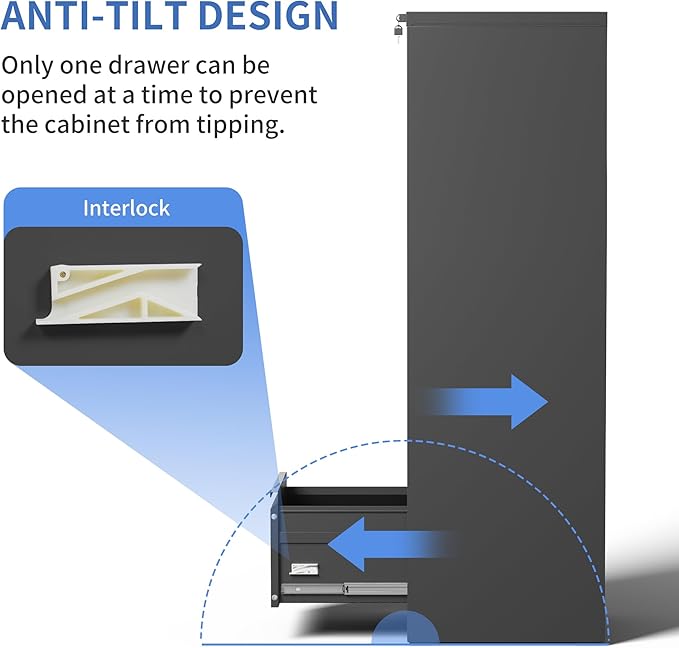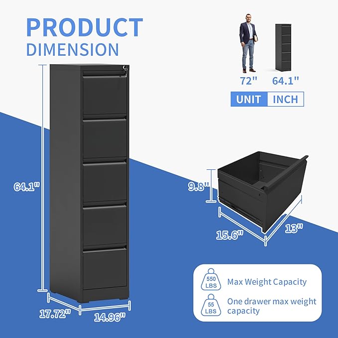 - 【Anti-tilt Design】This 5 drawer metal file cabinet designed with full extension and steel ball-bearing suspension, all drawers of the black vertical 5 drawer file cabinet can be opened and closed quietly and easily. The anti-tilt system ensures that only one drawer can be open at a time, preventing the metal file cabinet from tipping over. You can have peace of mind knowing that your important documents and items are safe and secure.