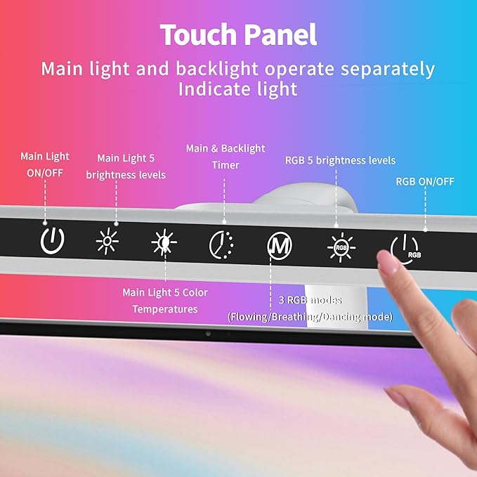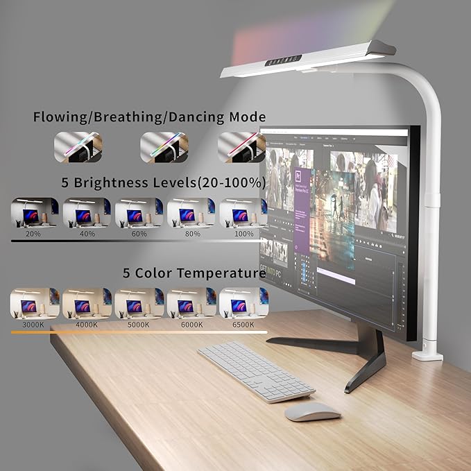 - 【Versatile Front Light Options】The clamp lamp has 150pcs LED beads, with 5 steps dimming function key that makes 23.65" transverse light bar provide decent brightness (20%-100%) and color options (3000K- 6500K).60 Mins timer setting will remind you to have a rest after working or studying attentively.The memory function memorizes your last setting.