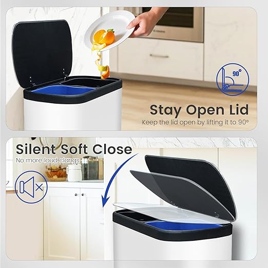 - What You Get: A dual trash can sized at 22.05βL x 16.54βW x 26.57βH with 2 x 8-gallon compartments, plastic inner buckets, and a soft closure mechanism for easy waste disposal.