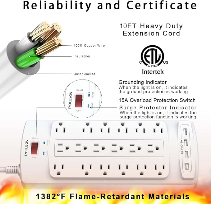 - Safety and Certificate: ETL safety certified, with extension cord and other major components certified by UL. The over current protection switch limits the power strip's working current to certain setting, so it will not get hot during usage. Environmental protection and fire-resistance PC shell with flame retardant at 1382β makes it more durable and longer lifetime.