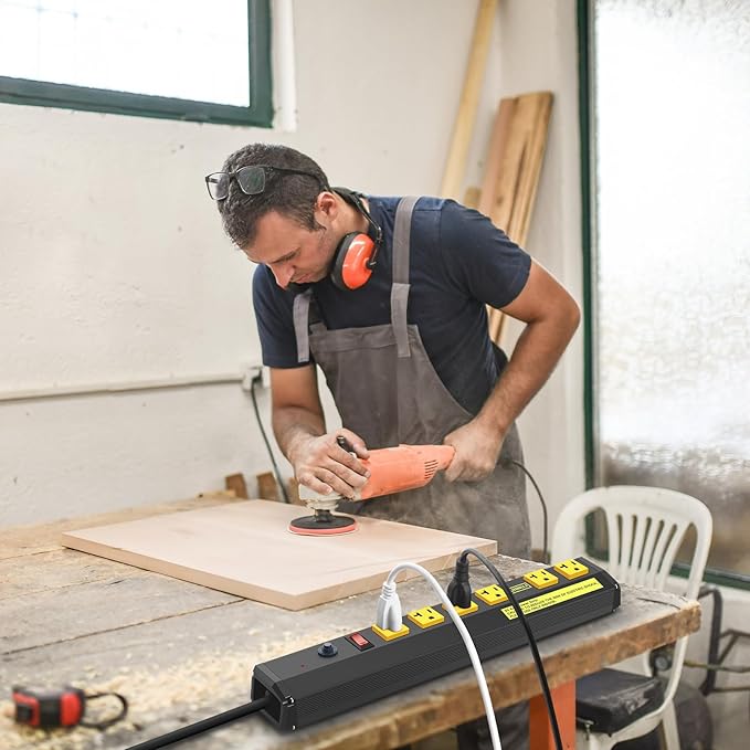 - Garage power strip supply board connected to 15ft 12AWG/3C power cord equipped with 20A high current, output rating 20 Amp/125 Volt/2500W. The shop power strip come with diagnostic indicator lights and an illuminated ON/OFF switch.