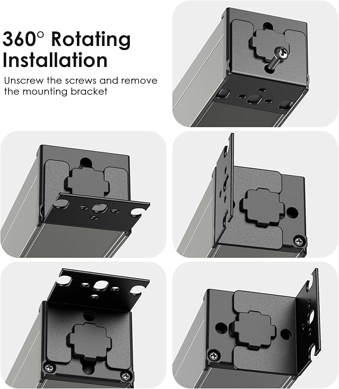 - Multiple Installation Options: The mounting brackets on both sides of the outlet strip can be installed flexibly in four directions, for a variety of scenes. 2 mounting brackets are locked on two sides of power bar when not in use, so they will not take up space and get lost.