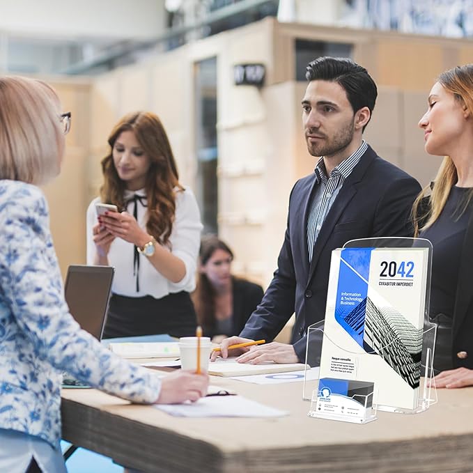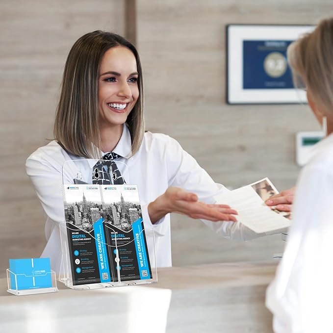 - 【1 Tier Flyer Holder】2 Pack acrylic brochure holder +2 Pack business card holder is ideal configuration for a brochure, pamphlet, and one sheet display stand for education, information, marketing, and sales