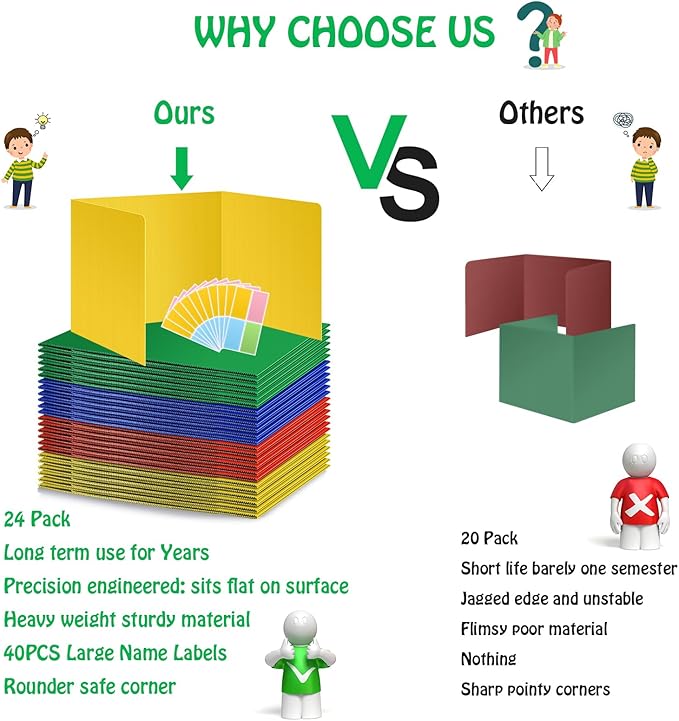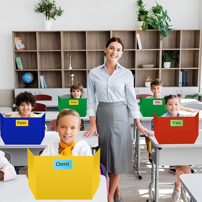 24 Pack Colorful Privacy Floders for Student Desks - Durable Plastic Erasable - Testing Dividers for Classroom - Easy Clean Privacy Shields for Student Testing Desk dividers- Includes Extra Labels