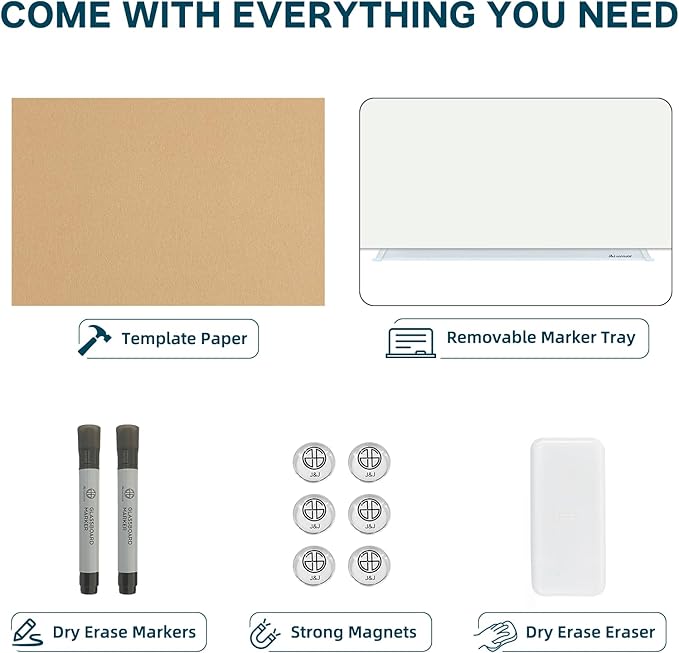 - 【ACCESSORIES INCLUDED】: 4 dry erase markers, 6 magnets, 1 glass whiteboard eraser, 1 removable aluminum marker tray. One-stop shopping. t's a great gift idea for your workmate, boss or spouse which can enhance the office/ house atmosphere