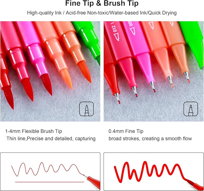 - Dual-Tip Versatility: Each marker is equipped with a flexible brush tip for broad strokes and blending, and a fine point tip for detailed lines and precision. Ideal for a range of applications including sketching, hand lettering, art projects, and design work.