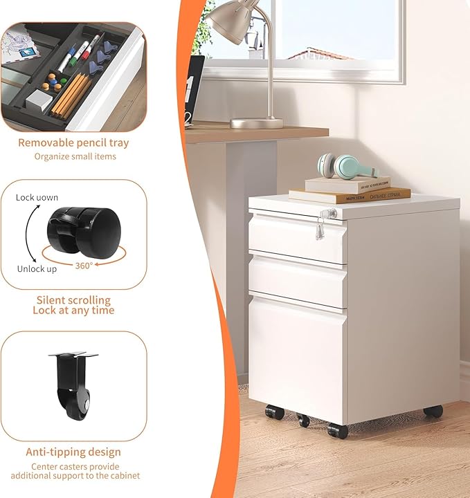 - Easy Mobility and Secure Locking: Our office file cabinets are designed for both convenience and security. This filing cabinet with lock comes with five wheels, including one anti-tilt wheel that prevents the cabinet from tipping over. The four main wheels allow you to easily move the small file cabinet to your desired location, and the two front wheels have brakes to ensure it stays firmly in place. This feature makes it easy to rearrange your office layout or place the locking file cabinet where it's most needed.