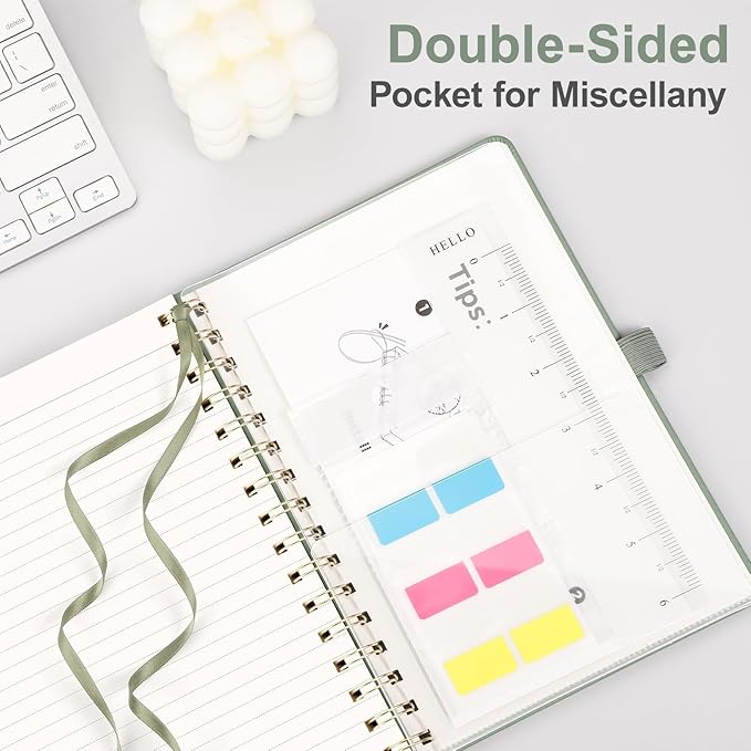 - PRACTICAL LAYOUT: Equipped an elastic band, a pen holder and removable bookmark ruler to keep your journal organized. Comes with a DIY bookmark with a ribbon for self-attachment to the spiral, serving as a bookmark. Features a double-sided pocket for storing miscellany and 18pcs sticky notes for additional organization and reminders