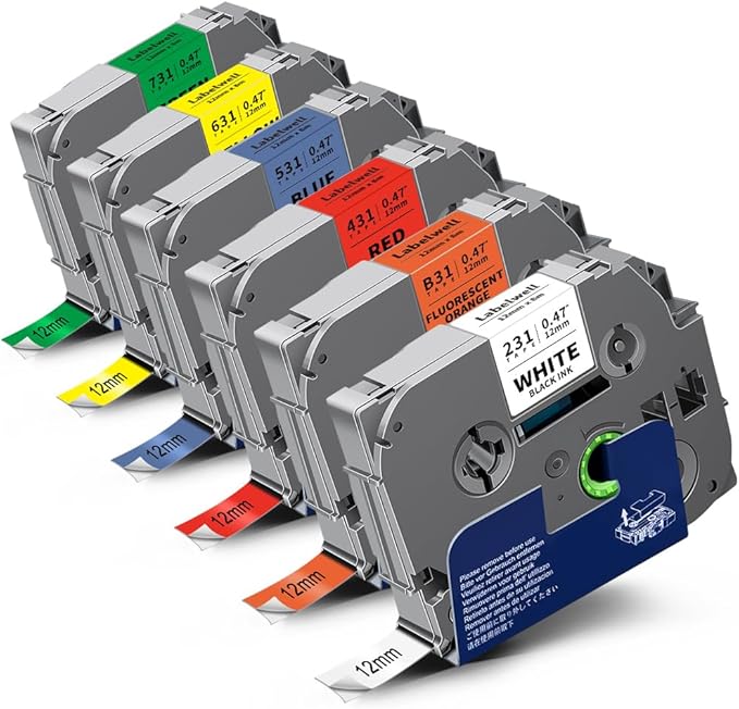 - Package Contents: 6-Pack Replacement for Brother P Touch Label Tape 12mm 0.47 Inch TZe-B31 (Black on Flu.Orange), TZe-131(Black on Clear), TZe-231(Black on White), TZe-431 (Black on Red), TZe-531 (Black on Blue), TZe-631 (Black on Yellow) Compatible with Brother P Touch Label Makers