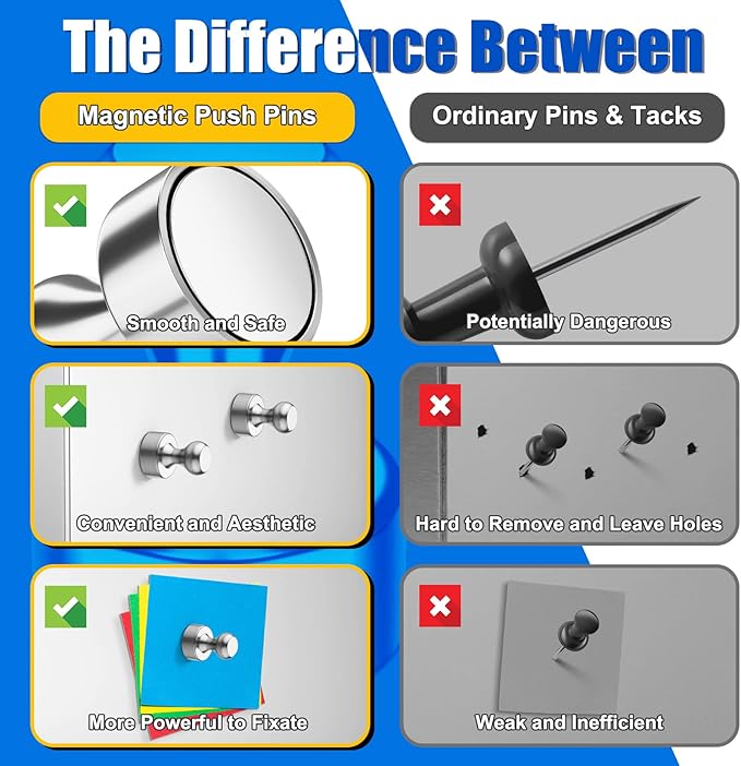 - DURABLE CONSTRUCTION: Crafted from neodymium with triple-layer coating, these fridge magnets are designed to last. Push pins magnets resist corrosion and scratches for longer-lasting performance in daily use