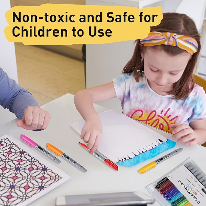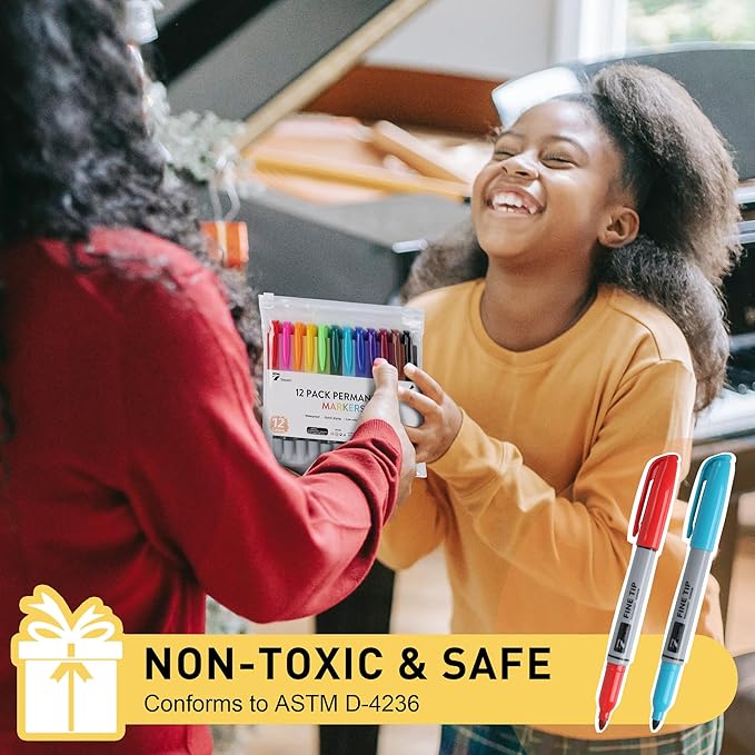 12 Permanent Markers - Assorted Colors Drawing Marker Pens Set, Waterproof Quick Drying Fine Tip Colored Artists Markers for Adults Coloring