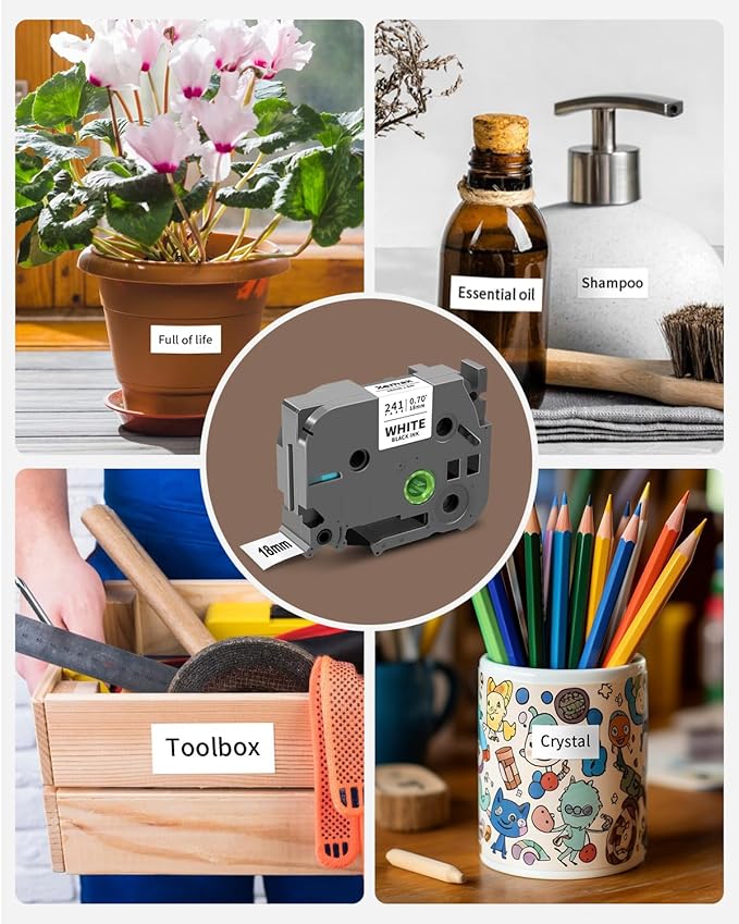 - Wide Applications: These 18 mm 0.7" black on white label tapes are suitable for indoor and outdoor use. The ptouch tape 18mm 0.7" white label is widely used in home, offices, schools, businesses, gardens, industrial, and more