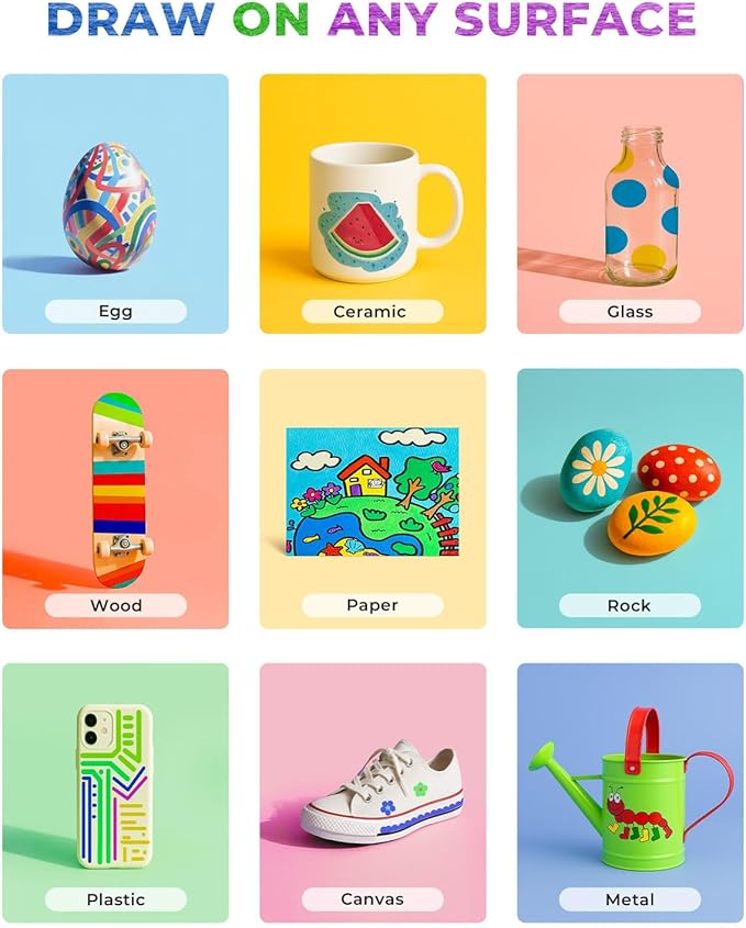 - Works on Various Surfaces: This acrylic marker works on nearly all surfaces, meeting the needs of professional creators. Whether it's rocks, canvas, fabric, ceramics, glass, wood, eggs, plastic, or ornaments, you can easily bring your creative ideas to life. Start your DIY craft or doodling projects anytime and enjoy the fun of artistic expression