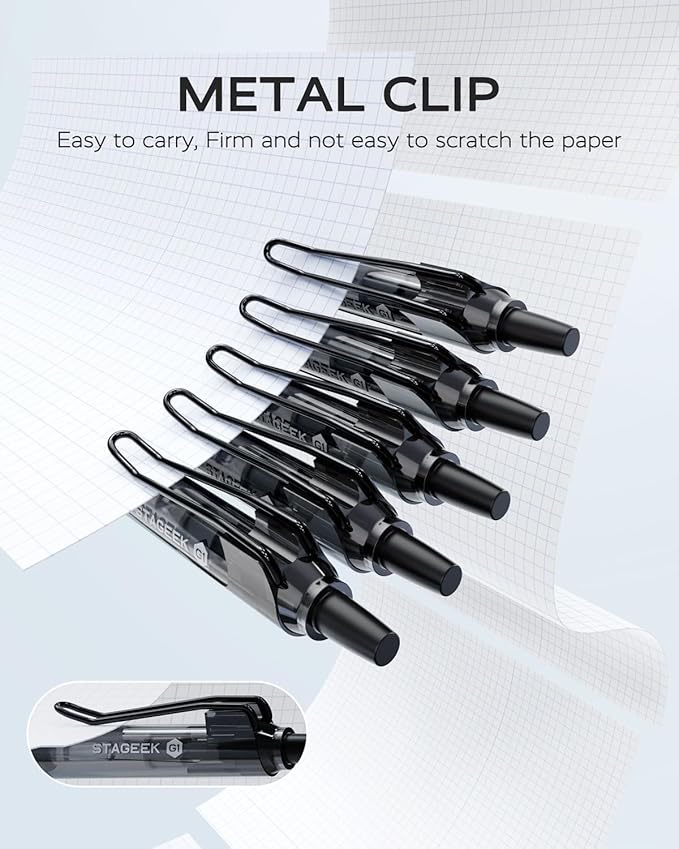 - [Metal Clip]: STAGEEK black gel pens metal clip designοΌmore stronger, more durable, and grips tighter. These black gel pens can easy to securely attach to notebooks or pockets. The fine point pen designed for convenient carry, youβll never lose these 0.5 gel pens
