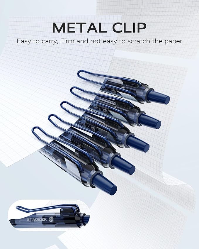 - [Metal Clip]: STAGEEK blue gel pens metal clip design, more stronger, more durable, and grips tighter. These blue gel pens can easy to securely attach to notebooks or pockets. The fine point pen designed for convenient carry, youβll never lose these 0.5 gel pens