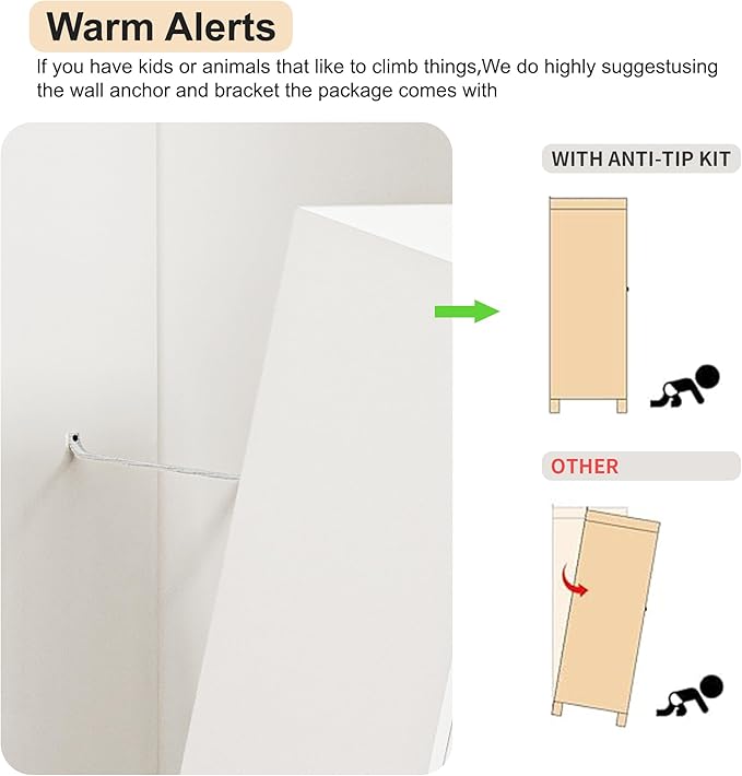 - Stability and Security: This storage cabinet is equipped with a robust base and anti-tipper mechanism that secures it firmly to the wall,eliminating any tipping concerns. Protect your and your family's safety, offering peace of mind even in the presence of spirited playful pets.Elevate your storage solutions with this stable, durable, and stylish pantry cabinet