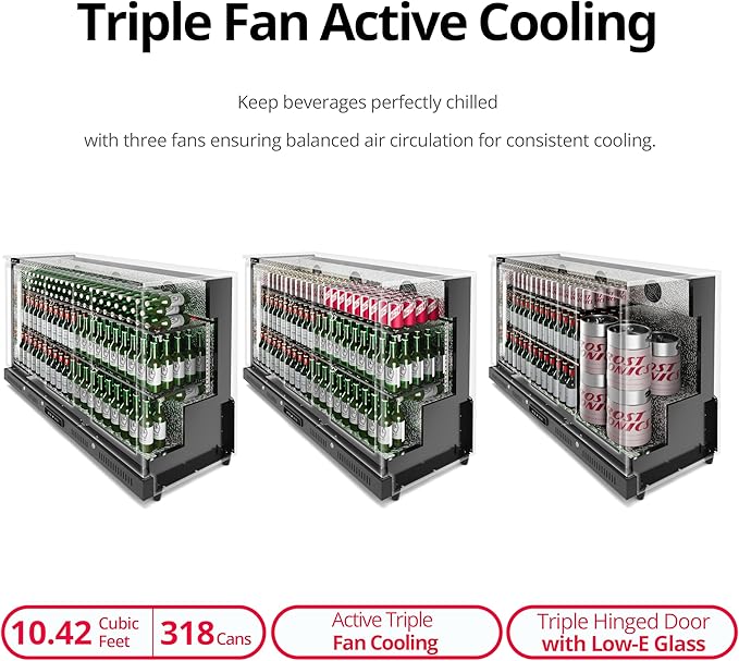 - 〔318 Cans Storage Capacity〕Tailored for medium to large catering events, house parties, and casual gatherings, your Frostronics triple hinged door beverage cooler features a generous 10.45 cu. ft. capacity, capable of holding up to 318 cans of the beverages of your choice. Its 6 adjustable and removable shelves provide versatile storage options, allowing you to easily make room for taller bottles or bulkier items, ensuring every inch of space is efficiently utilized.