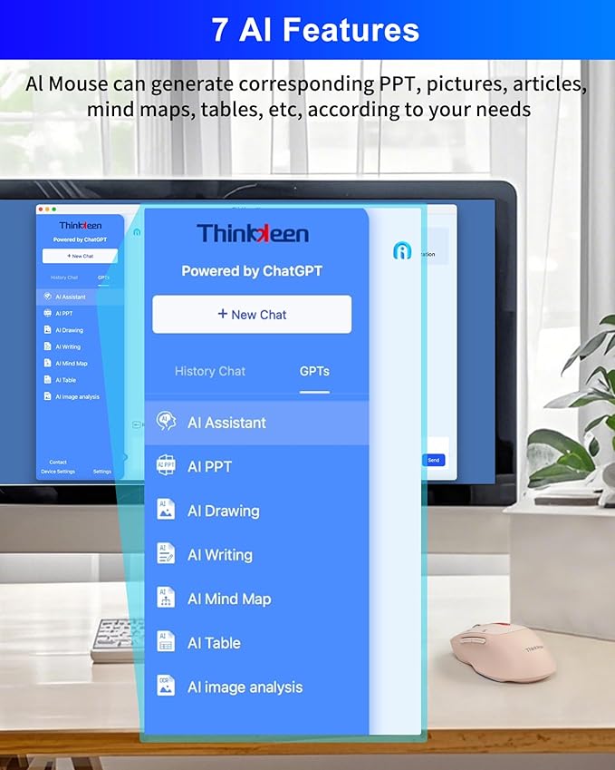 - 【AI GPT Mouse】The THINKKEEN AI mouse is an intelligent voice mouse that, in addition to its basic functions, can also achieve functions such as voice typing, voice search, voice control, voice translation, screenshot recognition and translation word recognition and translation, button customization, Al intelligent writing AI PPT, Al Drawing, Al Mind Map, Al Table etc.(Language translation in 152 languages)