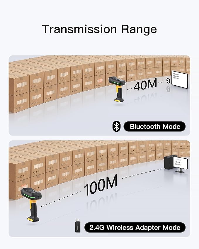 - Wide Compatibility & Extended Transmission Range: Supports three connection modes—2.4G wireless, Bluetooth, and wired. Compatible with Windows, Mac, iOS, Android, iPad OS, and Linux, catering to various scanning needs. In open environments, the transmission distance reaches up to 100 meters, while in indoor settings, it extends to 60 meters