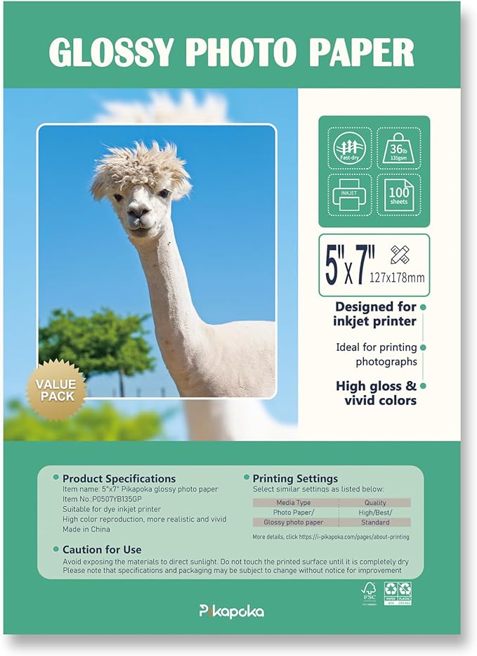 - Pikapoka Thin Glossy Photo Paper: 5R size (5 x 7 inches), 100 value pack, 36lb/135gsm.
