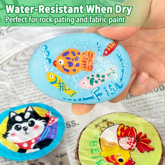 - 【Work Well on Diverse Surface】The waterproof acrylic paint markers can widely used on a variety of surfaces such as rock painting, fabric, wood, stone, glass, ceramics, metal, plastic, canvas, eggs, Halloween pumpkins, greeting cards, and more. Keep your artwork colors alive for a long time